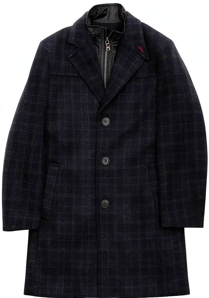 It is constructed from a wool blend fabric, which offers a balance of warmth, durability, and a refined appearance, making it suitable for various weather conditions.